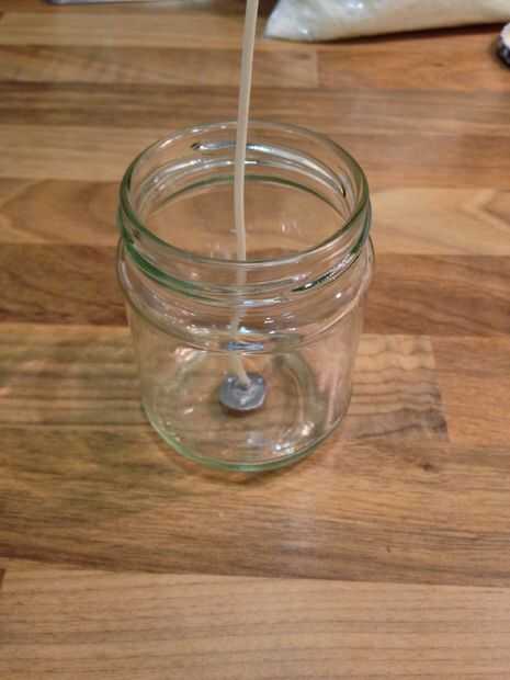Usa doble caras puntos para fijar la mecha en la parte inferior de la jarra. Estos no parecen sostener que bien pero es suficiente para mantener en su lugar cuando se vierta la cera. Se verá en el siguiente paso que he utilizado una pajita para mantenerlo en el ritmo.