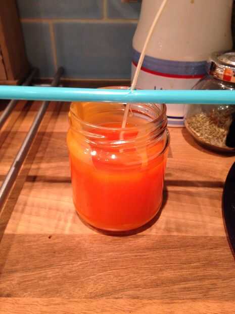 Para verter la cera necesita cuidadosamente levante la Jarra medidora de la cacerola y verter en los tarros. Yo estaba usando una jarra de cristal que consiguió bastante caliente, pero con un poco de toalla de cocina es fácil de levantar y verter.