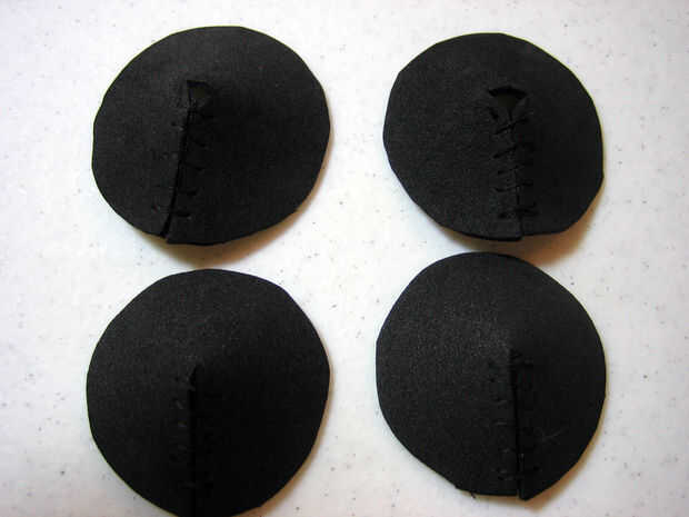 Hacer cuatro de estos. Dos de ellos será contra su piel así que tenga cuidado que sus costuras son tan suaves como sea posible (nos referiremos a estas piezas como los fondos). Los otros dos que vamos a coser la tela (llamaremos a estos las tapas). Los fondos deben ser ligeramente más pequeños que las tapas y no necesitan agujeros del ojal.