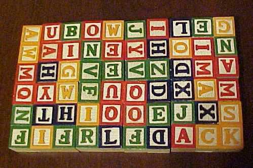 Encontrar bloques de su alfabeto. Estos son más pequeños que encontré en una tienda de hobby. Son aproximadamente 5/8"(cinco octavos de pulgada (1,5 cm)) en cubos. Se necesitan 60 de ellos. Sí, sesenta. También puede utilizar los más grandes que son aproximadamente 1 1/4"(una y un cuarto pulgadas (3,2 cm)) en cubos. Usted puede encontrar en tiendas de juguetes y en línea. Repito, usted tendrá sesenta de ellos.