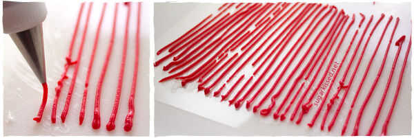 Utilizar el glaseado real para dibujar líneas en papel de cera. Si quieres separar tus chispitas de color, dibuja sólo líneas del mismo color al lado de uno. Las líneas deben correr paralelas entre sí y pueden ser tan largas como usted tiene gusto. Establecer al royal icing líneas a un lado para que se seque completamente.