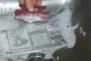 Ahora es el momento para iniciar el proceso de lavado. Inmediatamente separe las dos mitades del cristal y pelar la negativa de los polímeros. Siempre retire la negativa de polímero no el sustrato o el sello no tendrá un buen soporte para el derrubio. Colocar la imagen de polímero en la solución de lavado y frote suavemente con un cepillo de cerdas fina o cepillo de dientes suave hasta que todo el exceso de líquido polímero disuelto de la superficie del sello. Enjuague con agua para quitar el último de la solución de lavado. En este tiempo se puede recortar el exceso de polímero endurecido. Coloque el sello en el envase de agua y bajo la luz UV y exponer durante 10 minutos. Esto totalmente endurece el sello y hace menos pegajoso.