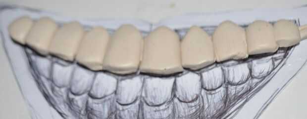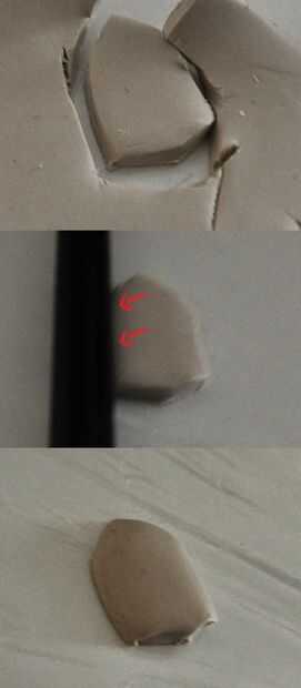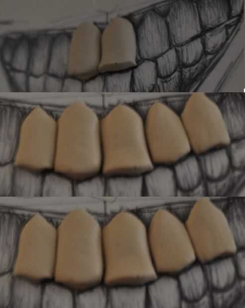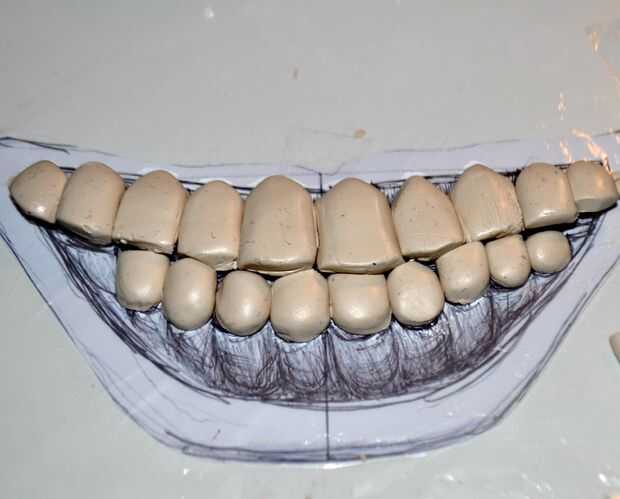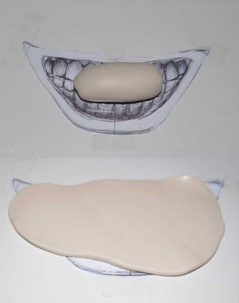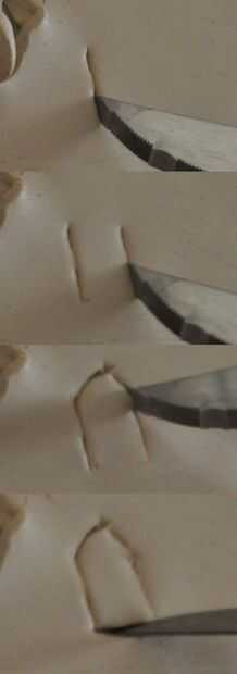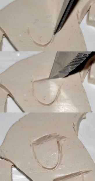 Tomar la mitad de su arcilla beige y ruede hacia fuera. Cortar cada diente (como se muestra en las fotos) y suavizar los bordes con el palo de su pincel.
