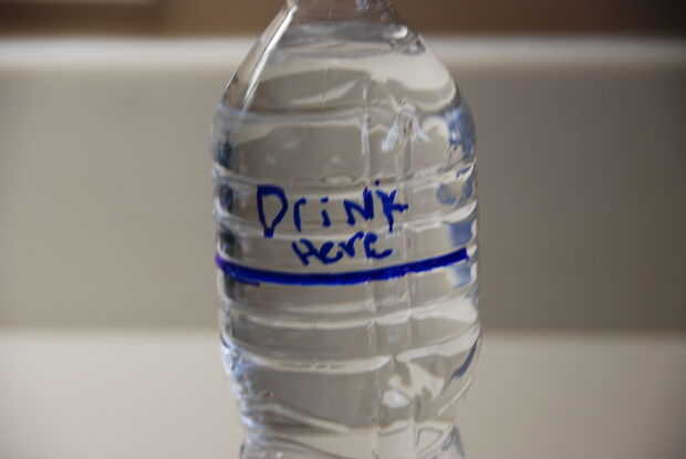 Beber el agua en tu botella de agua hasta donde veíamos, porque una vez que agregas la fruta tendrá más alto, además congeló ampliará la botella de agua.  Ya listo este paso!!!