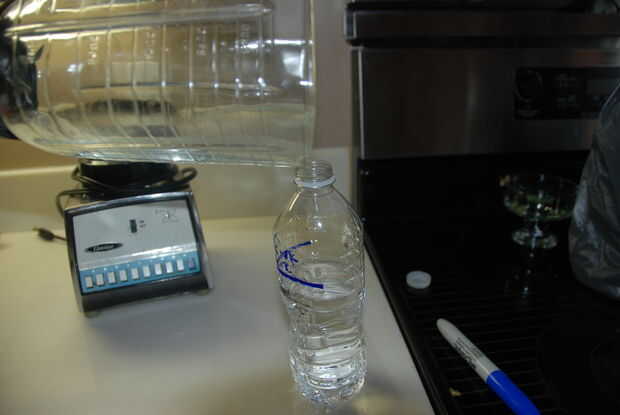 Vierta la fruta mezclada en su botella de agua hasta que el agua no es claro, lo que significa que pone mucha fruta en botella!!!!!!