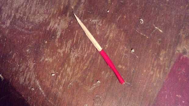 a continuación, vas a cortar una pequeña sección de la cinta para envolver alrededor de la talla de su palillo de dientes. Usted querrá cubrir toda la sección usable de los palillos con cinta adhesiva para proteger y estirar la piel.