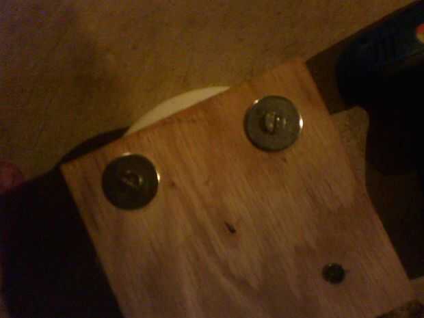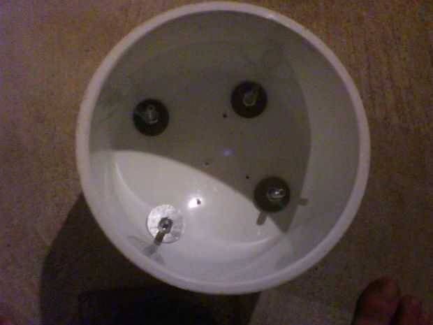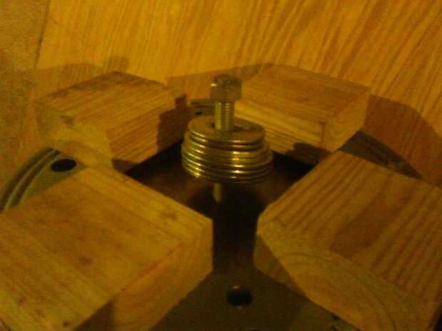 Ahora, después de comprobar que todo lo quede otra vez, utilice el taladro para ir todo el camino a través de las secciones adicionales de madera contrachapada. Ahora, os adjunto un pie largo 1/2 pulgada grueso perno en la parte inferior de la tapa de PVC, como algo para el concreto a retener más. Pegué las arandelas de defensa adicional, la mayoría de ellos más grueso que un agujero de 1/2 pulgada de otros proyectos que he hecho en el pasado. La razón de utilizar arandelas de acero es que químicamente, hormigón corroe al acero y por lo tanto, llevará a cabo a él mucho más fuertemente después de estar sentado durante unos días. La imagen que tengo de la armella muestra la tuerca y las arandelas en la parte inferior de la bandeja giratoria, pero me cambié por lo que la tuerca fue en la base del interior de la tapa de PVC, para el punto mencionado, permitiendo solamente una pulgada o menos sobresalen de la parte inferior.