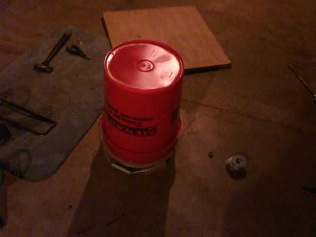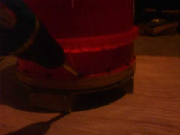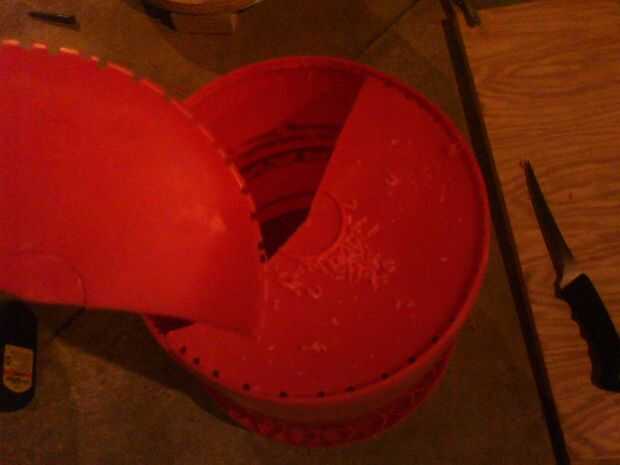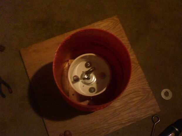 Uno de los mejores rasgos de mi escuela de kung fu (www.peoriakungfu.com) es que mucha de nuestra práctica se basa en el concepto de uno mismo-descubrimiento. Estaba tirando de dos cubos, intentando averiguar cómo tal vez podría construir una forma de postes de 2 x 4 y secciones de madera adicional para verter el hormigón alrededor de la base, para asegurarse de que quedó al ras para siempre. Así, el cubo bajó totalmente incluso con el disco de madera. Llegué a pensar (ya sé, peligroso). Sólo usé un montón de tornillos para atornillar la parte superior del borde del cubo hacia abajo en el disco madera. Fresco de cómo funcionó. A partir de ahí, solía un cuchillo de cocina simple para cortar el fondo de la canastilla, por lo que pude verter el hormigón (cuchillo de filete, creo - lo siento Danny, voy a comprar un nuevo cuchillo de filete). Yo también pato grabado en los lados del borde del cubo alrededor de la base de disco de madera, en caso de cualquier concreto comenzó a escaparse hacia fuera.