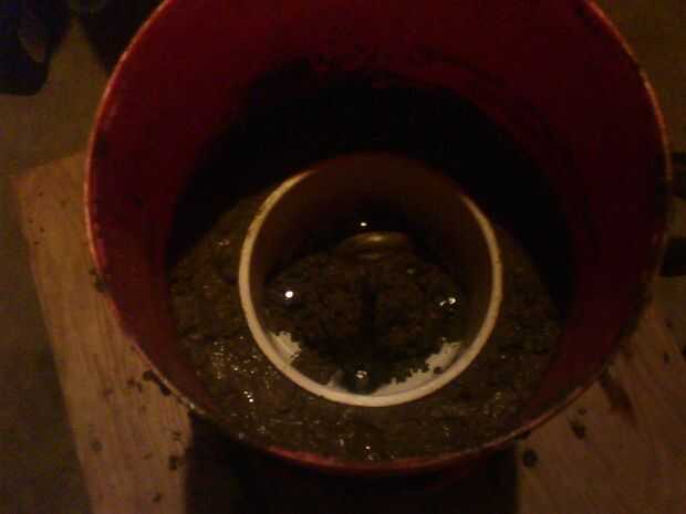 Desde aquí, temporalmente poner una sección de 5 pies de 6 pulgadas dimater del PVC en la tapa de extremo, el hormigón y vertió en los lados alrededor de la tapa de PVC, formando hacia el lado del cubo. Realmente no se puede fotografiar muy bien, la consistencia de las áreas de este instructable que tendrás que descubrir por ti mismo. Digo que quiere que sea más líquida como a diferencia de grueso y sólido - no tanto que el agua se aprecia en él tan fácilmente, pero cuando estás cayendo en, quedar con un par de sonidos de la 'mancha'. Asegúrese de que las formas concretas bien contra el borde de la tapa de PVC y dejar el tubo de 6 pulgadas dentro de la tapa de extremo para que los lados no obtener aplastados hacia adentro por el hormigón.