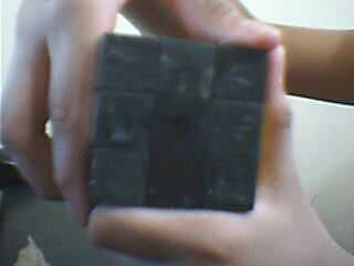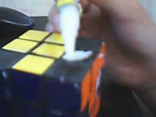 Toma el pegamento y arrojar a chorros una cantidad del tamaño de guisante en la superficie donde están pegando la cubie. Alinee la cubie y apriete duro. Repita este proceso hasta haber pegado todos nueve cubies en.