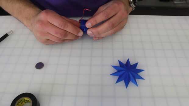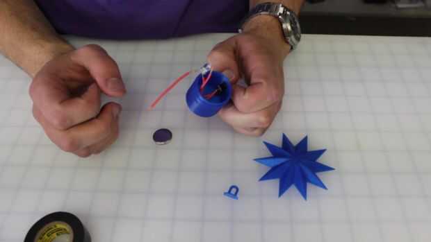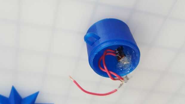 A continuación empuja el pequeño gancho 3D impreso a través de la ranura en el lado del recipiente y luego lo pegan en su lugar.