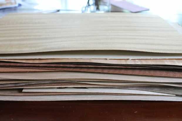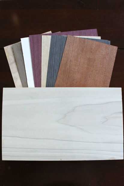 Un buen surtido de diferentes especies es clave para que la tapa de pop. He comprado un pack de chapas surtidas de Woodcraft que vino con cerca de 30 hojas diferentes para elegir. Quería asegurarse de que los bosques estaban relativamente cerca de los colores de la cubierta del cómic. Originalmente se iba a usar un roble gris azulado para parte de Spiderman, pero cambió después de darse cuenta que esa chapa particular fue teñida. Chapas teñidas no láser graba bien, por lo que cambié a nuez en lugar de otro. Terminé eligiendo la caoba, nogal, cerezo, bambú, arce, Lyptus y Purpleheart para esta cubierta.