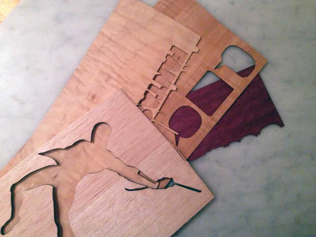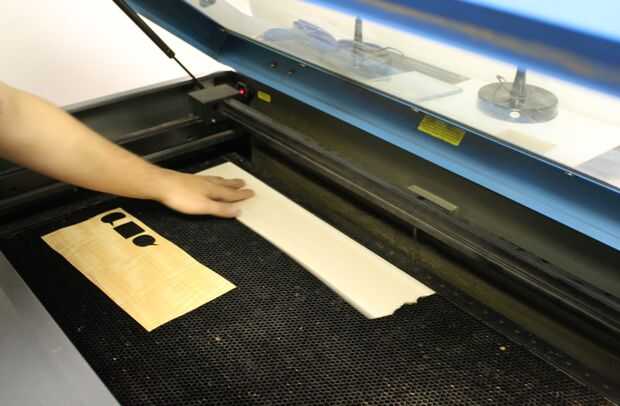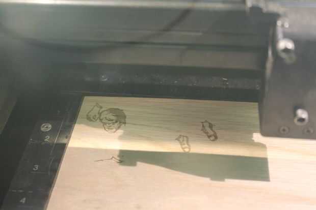 Al grabado de la chapa de madera, asegúrese de utilizar un ajuste de potencia que se desprender demasiado material, ya que la chapa es muy delgada. Un ajuste de potencia de media baja a una velocidad relativamente alta funciona bien para esto. Las partes grabadas queman ligeramente, lo que le da un bonito contraste.