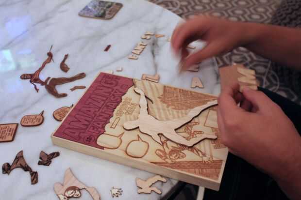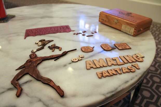 En primer lugar todas las chapas a sus correspondientes piezas de balsa pegados. Pegando el banner superior de purpleheart a la tabla vino después, seguido de las letras del título, burbujas de palabra, etc. a la plancha. Guardé pegado de Spidey y el criminal para el final.