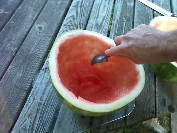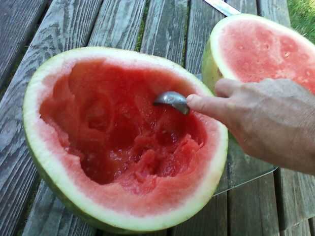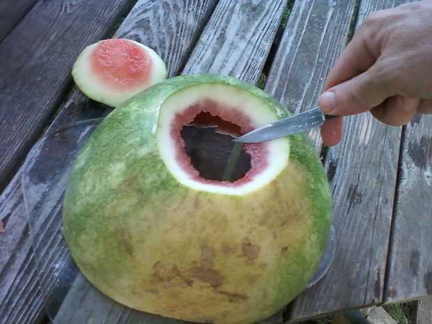 1. cortar la sandía en una manera tal que (a) usted puede comer y (b) puede ser utilizado para el cuarto-o-lantern. Yo sólo la rebanada por la mitad a través de su "vientre".