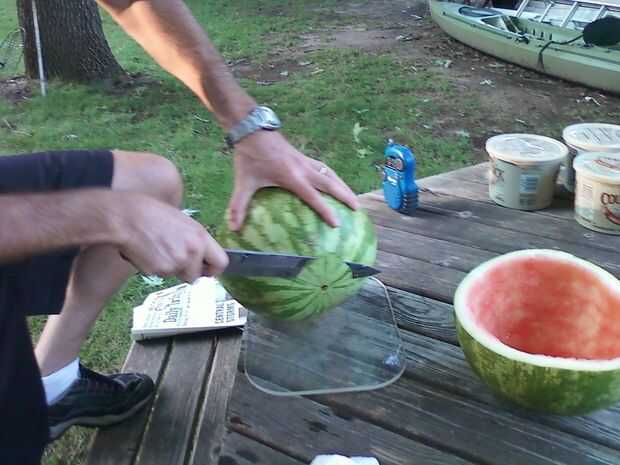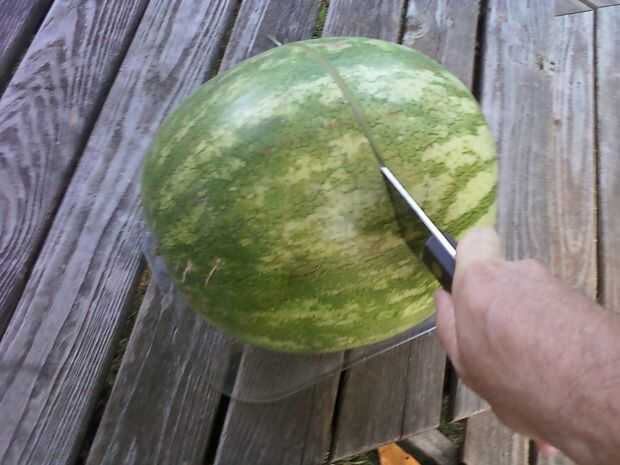 4. una sandía probablemente no levantarse como una calabaza. Por lo tanto, probablemente usted necesitará cortar un pequeño trozo en la parte inferior a la mitad. Trata de no rebanar por más el jugo de sandía se agotarán en todas partes.