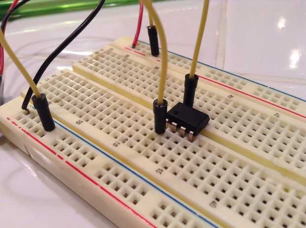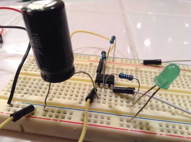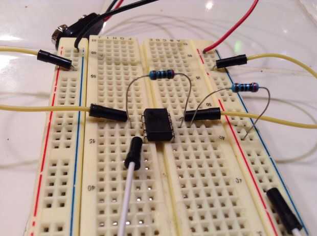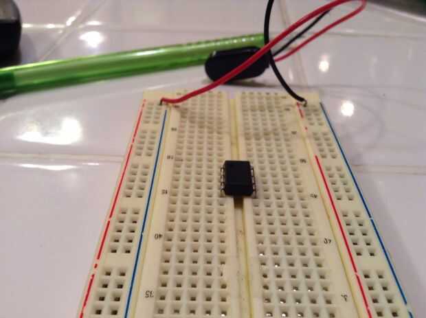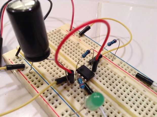Primero poner su chip 555 temporizador en la protoboard y clip de la batería de 9 voltios. Luego conecte el Pin 1 a tierra y pin 8 a positivo. Luego conectar el pin 4 al positivo. Conecte sus dos resistencias, una primera del pin 2 al pin 7, luego del pin 7, positivo. Conecte el led con la resistencia del pin 3 a un agujero vacío en protoboard, luego el led de la resistencia a tierra. luego enganche el condensador del pin 2 a tierra, (Ten cuidado con los condensadores electrolíticos están polarizados!) Por último un puente del pin 2 al pin 6.