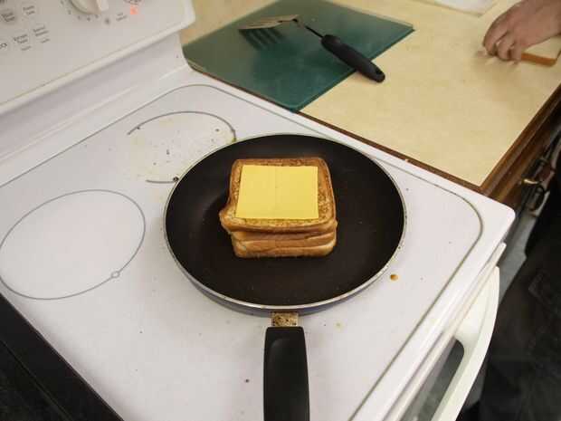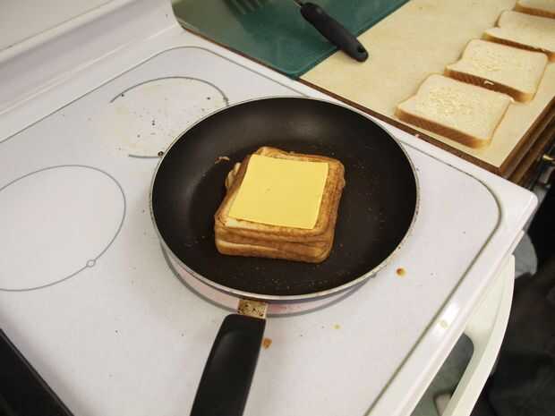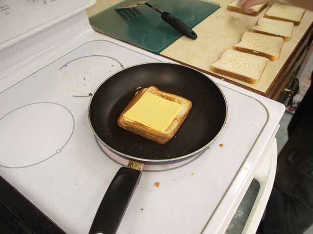 Añadir otra loncha de queso en la parte superior con pan de mantequilla para arriba otra vez.