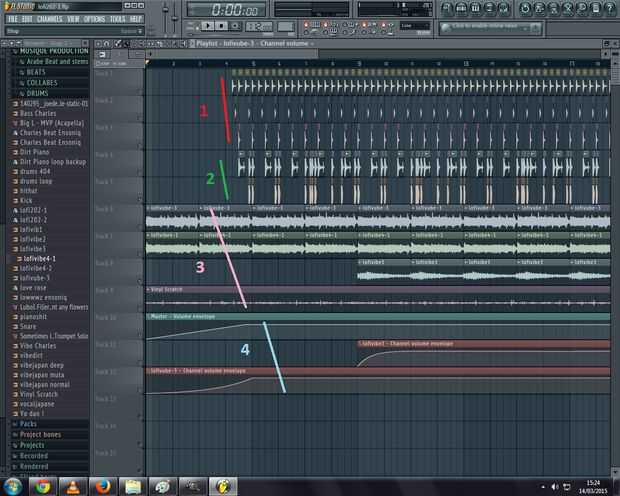 4) y los 3 últimos son los "clips de automatización" de las muestras, con el fin de controlar el enveloppe de volumen de las muestras en el tiempo.