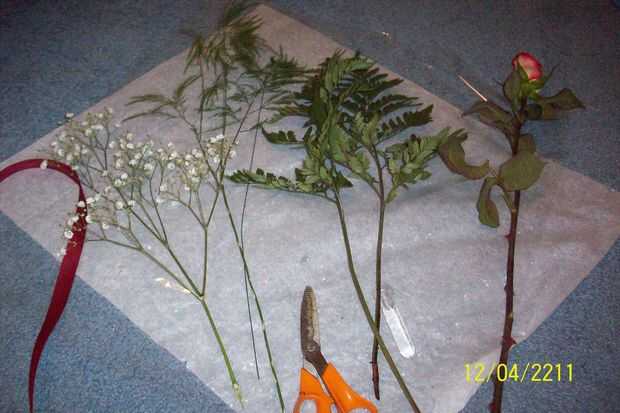 -Relleno (generalmente unos pequeños pedazos de babys breath, fern del árbol, estado, etc.)