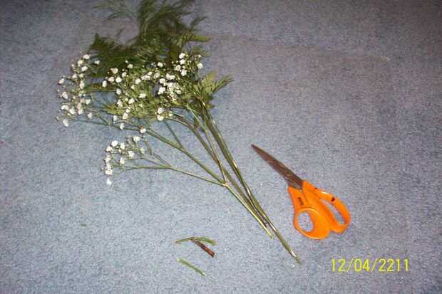 Recortar los fondos de los verdes (tu cuero y relleno) hasta que encajen en el cuadrado diagonalmente. Debe haber unos 5" de sobra en la parte inferior del celofán. También puede recortar las piezas de helecho y aliento de bebé, etc. para que vea bien. Recomiendo no cortar el cuero porque quieres que sea tan completo y verdes como sea posible.