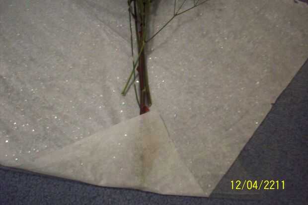No quiero tus flores demasiado concurrida y juntas, para que no ruede el celofán muy apretado. Pero si usted lo deja muy suelto, podría caer hacia fuera. Al terminar la circunferencia de la parte superior debe ser alrededor de 5 pulgadas o menos.