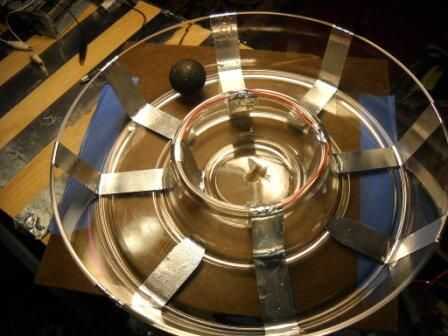 Lo que ves es las tiras de cinta de aluminio cargado y en un bow.l que se utilizan para crear cargas eléctricas que cambian varias veces el cargo de una pelota de ping-pong conductively pintado. Esto resulta en una especie de motor que propulsa la bola alrededor de la circunferencia del recipiente.