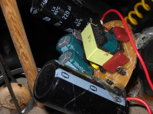 Desmontar un cfl. Coloque un par de condensadores masivos. Polaridad es probablemente importante, pero no sé cómo decirles adjuntarlos. He trabajado a través de este proyecto con ensayo y error, (sobre todo error).