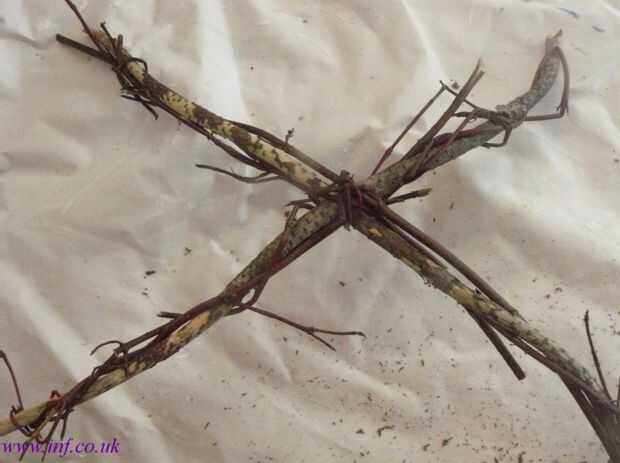 Puede utilizar espigas simples de las mariposas para colgar de. Sin embargo para un look más rústico había utilizado algunas ramitas secas del jardín y la herida les redondo con tallos de Cornejo. Hilo invisible se utilizó para garantizar en forma de Cruz