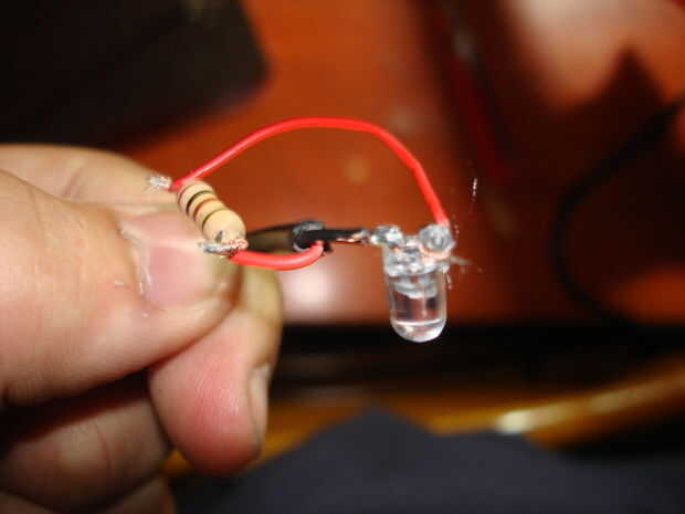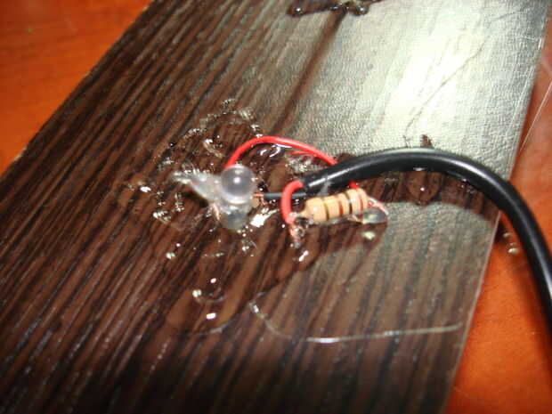 Ahora toma el cable usb y lo tira. Conecte el rojo y negro los cables a la resistencia y el LED (véase el cuadro) y péguelo en el bloque de madera.