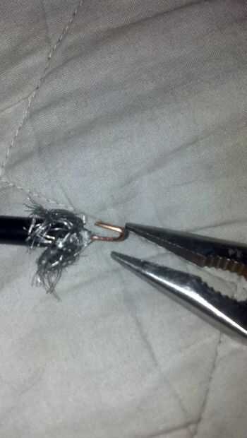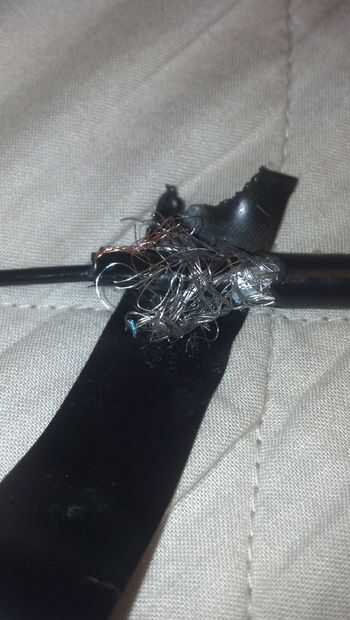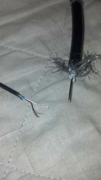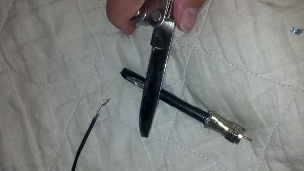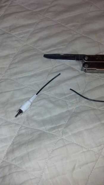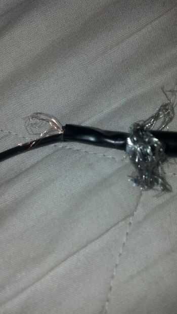 Para empezar,... oh hará sencillo con el 1-2-3 instrucciones. 1. tomar el cable coaxial y cortar por lo menos 3" del tornillo en el conectador. 2. Tome el cable RCA (hay el mismo en el interior) y lo mismo como en el cable coaxial. Usted puede hacer como quiere. 3. dos cables de 1" desde el punto de corte de la tira. En ambos cables bajo la primera capa de plástico, hay generalmente plata aunque los colores pueden variar. Estos son los cables negativos. el cable que está generalmente debajo de una capa blanca de plástico (este es el cable positivo y el plástico es para separar los cables positivos y negativos) tira de ese plástico entre los dos alambres y mantener los cables separados. Para más detalles sobre estos cables, no dude hacer cualquier pregunta o utilizar un motor de búsqueda. 4. use los alicates de punta para hacer una u en el cable positivo del cable coaxial. (cuadro 6). 5. trence los cables positivos de ambos cables. (cuadro 7). 6. Tire de los cables negativos para que no entran en contacto con los cables positivos. Luego, tome aproximadamente 2" de cinta aislante y cinta alrededor de los cables positivos. (fotos 8 y 9). 7. ahora una vez que los cables positivos son pegados, tire de los cables negativos sobre la cinta aislante que cubre los cables positivo para que se toquen los cables negativos de ambos cables. Luego cinta alrededor de los cables negativos como hiciste con el positivo los cables una cinta alrededor de éstos hasta que crees que este cable que acaba de hacer no despiezar cualquier momento pronto. (cuadros 10, 11 y 12).