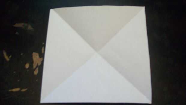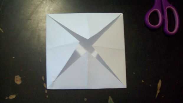 OK ahora va a tomar todas las esquinas y doblar después en el punto central de la X para hacer un círculo más pequeño que antes y también llenar esa plaza con cuatro triángulos pequeños