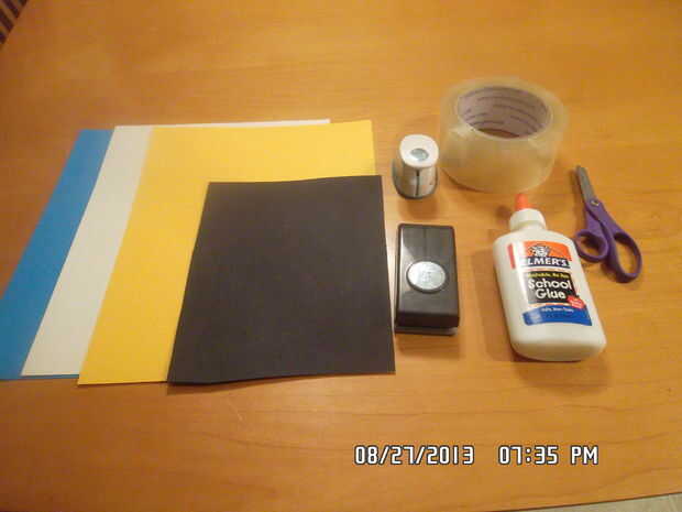 Necesita, un papel de su elección, papel blanco, amarillo y negro, pegamento, cinta, tijeras, y si usted hav punchers del agujero que puede usarlos si no solo cortar los círculos. también necesitará papel de SCRAPBOOK! (olvidé poner tht en la foto!)