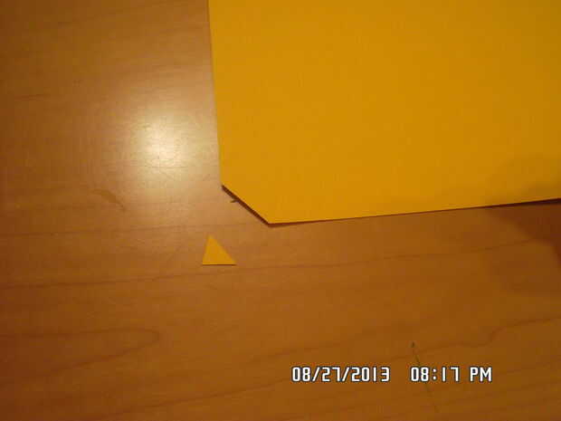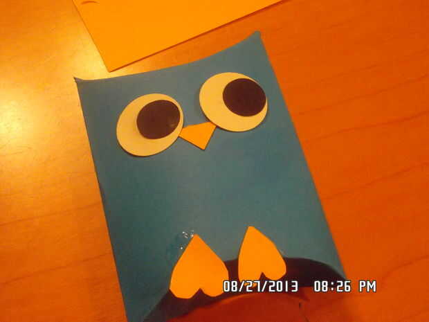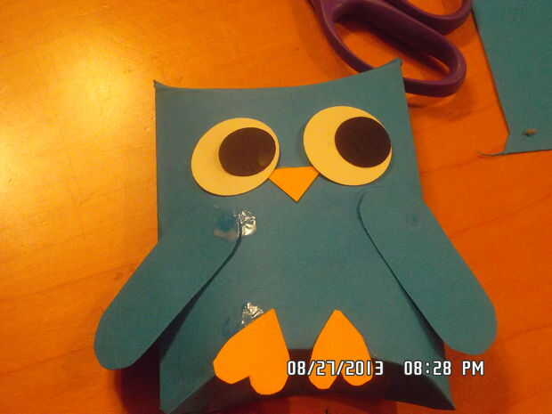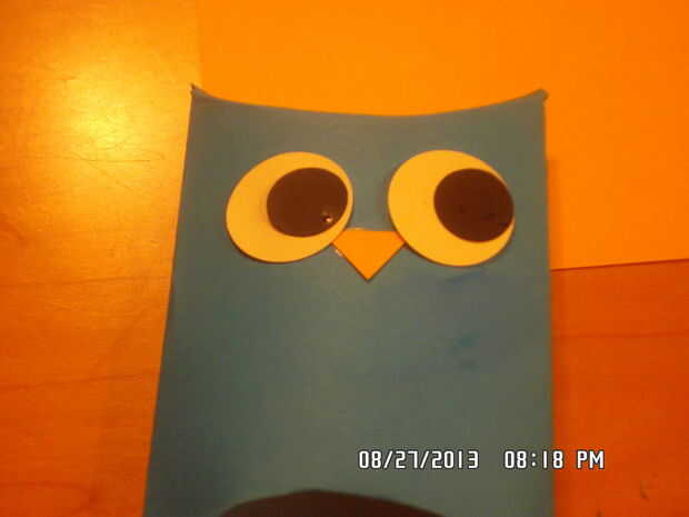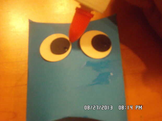 Se pega los ojos en el cuerpo y cortar un triángulo amarillo y cortar dos corazones amarillo y dos óvalos azules. Luego pegarlos en.