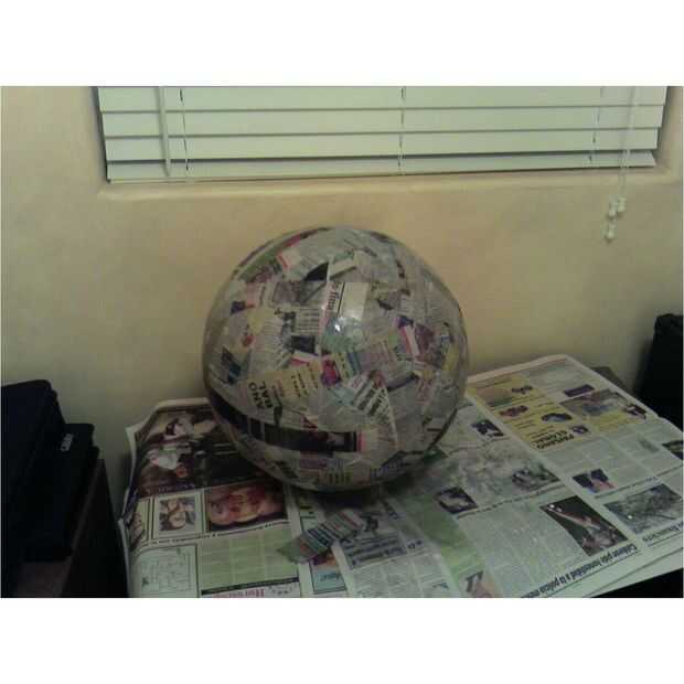 Sumerja las tiras de periódico en la mezcla de pegamento, asegurando que se mojó completamente. Limpie el exceso de pegamento y coloque la tira sobre la bola. Cubrir la bola entera con una capa de periódico y dejar secar durante 24 horas. No deje ninguna parte de la bola expuesta.