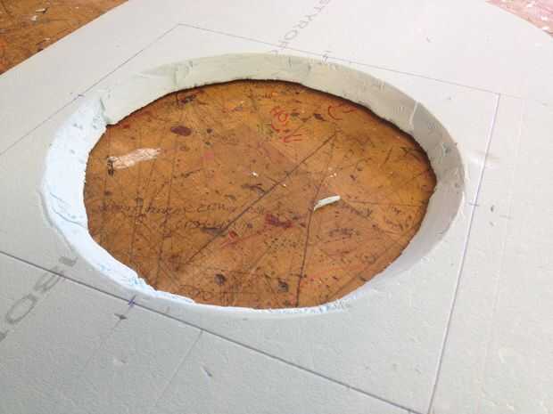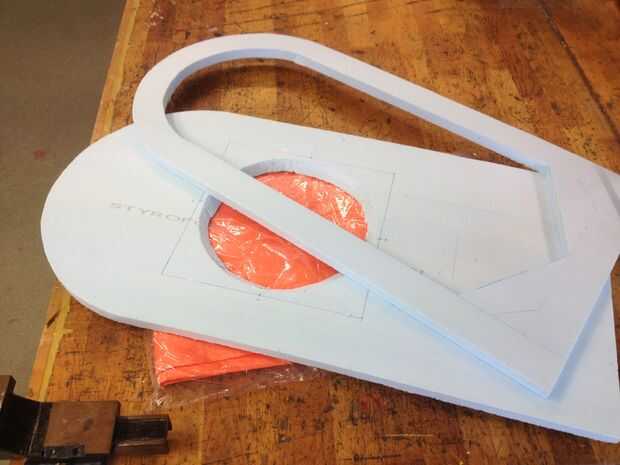 -Después de eso, cortar un círculo en el medio de una tabla. Asegúrese que el agujero esté exactamente en el centro el ancho. Tiene que ser un poco más en la parte delantera (que tendrá su espacio en la parte posterior el aerodeslizador), pero no demasiado en el frente! Y es mejor si tienes el cuchillo en un ángulo, para que el aire fluye hacia el centro.