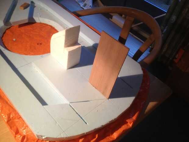 Como se puede ver, la motortower y el timón son colocados/pegar otro trozo de cartón pluma, que se pega a la placa base. Hice esto para asegurarse de que están ambos de pie estables. Más tarde, también puede colocar usted spoiler en este pedazo extra de cartón pluma.