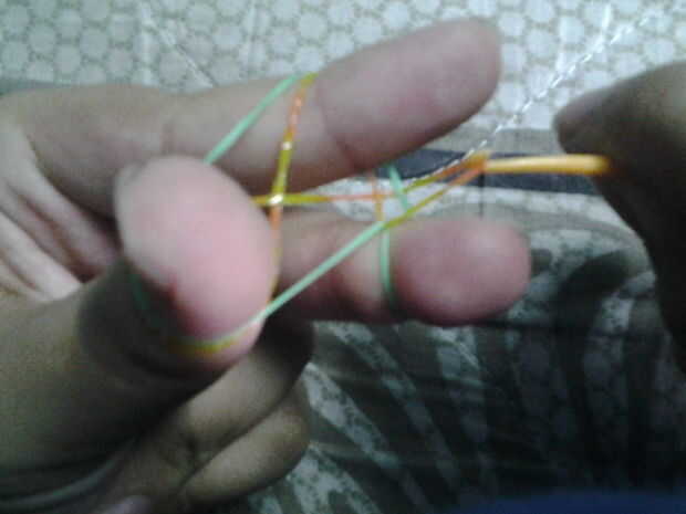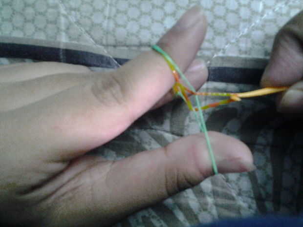 1 entonces que hacer en otras pulseras de goma, igual que coge la última banda en el dedo pulgar y coloque dentro, luego con el mismo de los dos dedos. 2 tomar el lápiz y ponlo en un agujero que se va a realizar entre sus bandas como en la imagen.