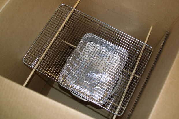 he utilizado un estante de enfriamiento para mantener los alimentos y una desechable rejilla para la bandeja de goteo de la hornada.