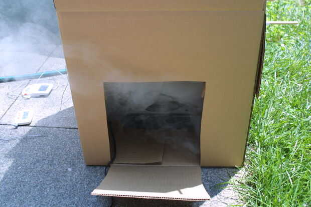 Cerrar la caja y deje que se fume. Mantener la caja cerrada mantendrá la temperatura, que es bueno ya que todo esto se calienta por un Hot Potatoes. Idealmente, usted quiere la temperatura a unos 225 grados F. Cuando veas la parada humo, cambie las virutas de madera. Para mí esto era cada hora y media más o menos