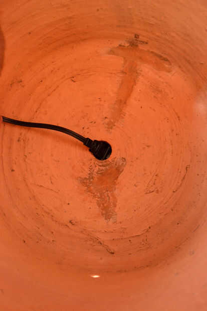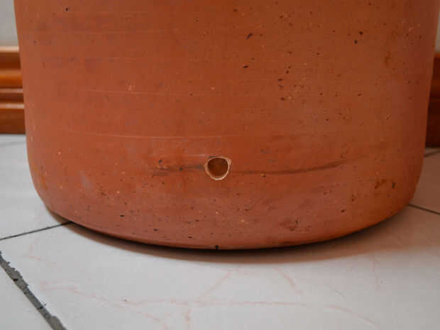 Si tu olla no tiene un orificio de drenaje para pasar el cable debe hacer uno. En mi caso fue una en la parte inferior lo suficientemente grande como para pasar el enchufe. Pero tuve que elevar un poco el quemador para que el cable pasar libremente; He hecho esto antes de hacer el orificio de la perilla para que la altura que mide es la altura final de la hornilla.