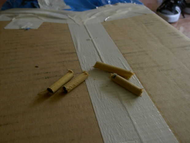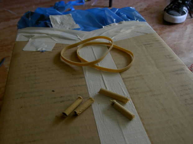 Entonces su banda de goma y empuje por los dos agujeros. En orden para la goma a permanecer también necesitará tomar estos pequeños trozos de madera y ponerlas debajo de cada lado de la banda de goma.