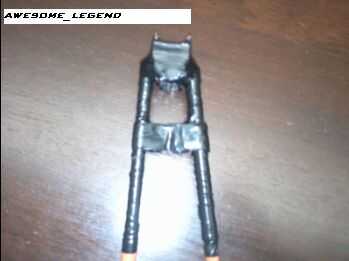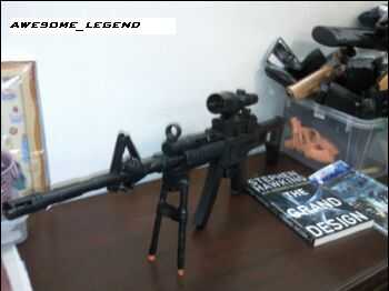Ok, ahora, cubre lo todo con cinta aislante negra, excepto la parte inferior de los tubos de soportes. Entonces, ahí tenéis su bípode! Y también, por debajo es un MP5 modificado a un rifle de francotirador y el alcance también es casero. :)