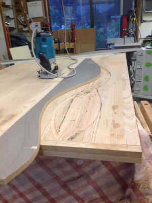En los últimos cinco años había utilizado conchas de mar y resina de fundición en ESTUCHERIA. Decidí que podría mejorarse la pobre se unen en una de las piezas de la tapa de tabla insertar una forma con un router y llenando con conchas de mar y resina. El primer intento de esto produce un resultado que estaba muy disgustada con él y entonces decidió hacer una plantilla que podría ser utilizada con un router que la longitud de una mesa en forma de un río o una serpiente. He quitado la resina y conchas desde el primer intento con gran dificultad y diseñado una plantilla MDF que guiará la fresadora como se muestra en la imagen.