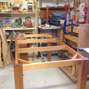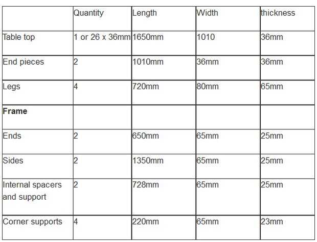 La madera para hacer la mesa y las patas todas tuvo que laminar como la madera después de dimensionamiento no era de suficiente grosor. Para hacer una pierna robusta que cada pierna tuvo que ser laminado dar un 80 mm dimensión 65 mm. Cada una de las piezas del marco también se había plastificado en las dimensiones que se indica en la imagen adjunta.