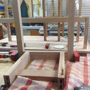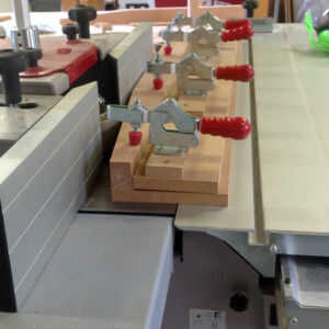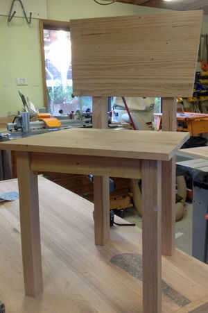 Yo no pude forma el asiento o el respaldo de las sillas porque no tengo suficiente madera de la calidad que se requiere. Asiento y respaldo tuvieron que ser plana. Dado que se trataba de un escenario al aire libre que las piernas tenían que ser considerable como se van a mojar tarde o temprano. Así que diseñamos un perfil de la pata trasera que era recto y no se adelgaza en la parte inferior. Hice una plantilla para moldeador de las piernas usando MDF y formado a través de mi eje.