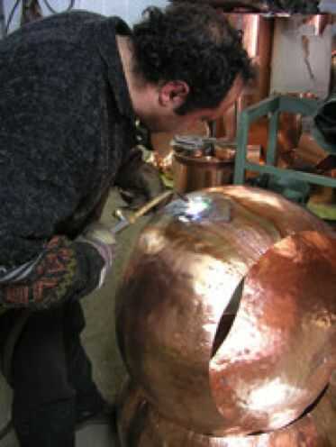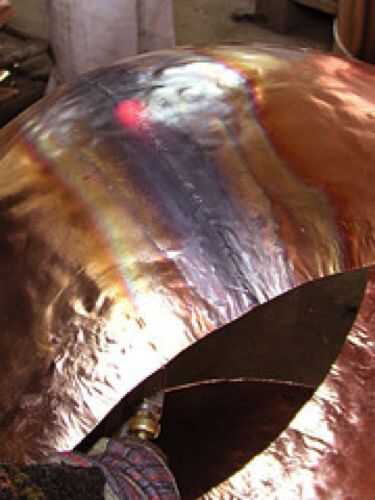 La parte que compone el abdomen o el flanco está unida por soldadura a las puntas de cola de Milano. Esto se hace por gas oxiacetilénico soldadura que hace el cobre suave y maleable. La Unión entonces es examinada cuidadosamente para detectar cualquier defecto antes de ser golpeado con el fin de recuperar su fuerza y resistencia en un proceso conocido como aplanador. El resultado es una Unión casi perfecta.