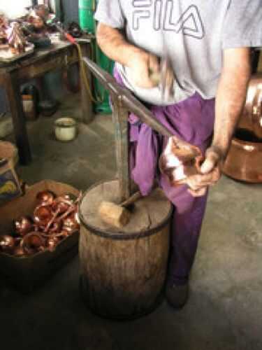 La cabeza todavía está formada por un solo disco de cobre. Este disco se sujeta contra un molde o forma anterior en un torno mecánico y como gira el artesano hábilmente aplica la cantidad correcta de presión a través de herramientas de mano, poco a poco la cabeza todavía adquiere su forma distintiva y peculiar de la cebolla. Este proceso requiere destreza y habilidad considerable.