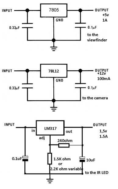En este paso tienes que hacer los circuitos, que apoyarán la camera(12v), la LED(1.5v) y la viewfinder(5v) con el poder. El LED tiene una batería propia. El visor y la cámara utiliza las otras dos baterías juntas como se puede ver en la tercera fotografía. Después de que he terminado con los circuitos me hace forma de U de aluminio y atornillar la parte posterior de los reguladores que necesitan refrigeración (5v y 1, 5V).