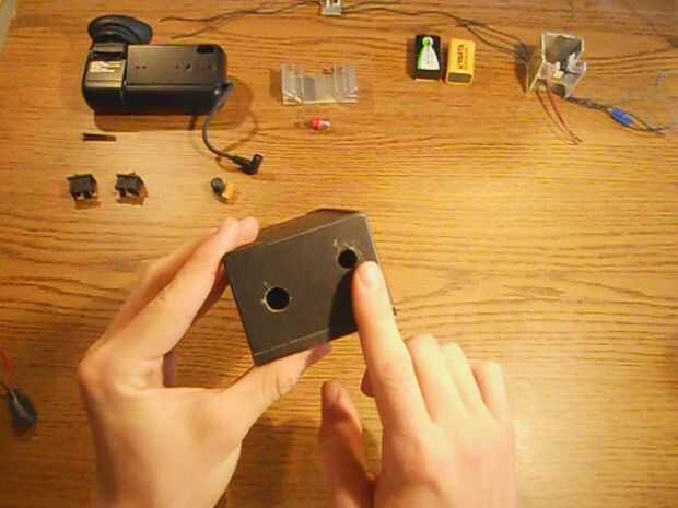 perforé dos agujeros redondos en el lado derecho de la caja y dos agujeros cuadrados al otro lado. Luego perforé dos agujeros pequeños en la parte superior de la caja para el visor.
